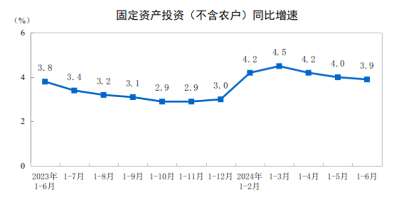 2024年1—6月份,全國固定資產投資(不含農戶)245391億元,同比增長3.9%。其中,民間固定資產投資127278億元,同比增長0.1%。從環比看,6月份固定資產投資(不含農戶)增長0.21%。