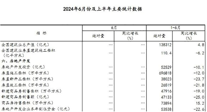 2024年上半年全國建筑業房屋建筑施工面積110.4億平方米,同比下降6.2%。全國房地產開發投資52529億元,同比下降10.1%。其中,房地產開發企業房屋施工面積696818萬平方米,同比下降12.0%。